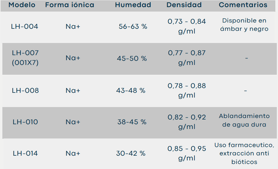 Detalles técnicos de Resinas de Intercambio Catiónico LINHAI
